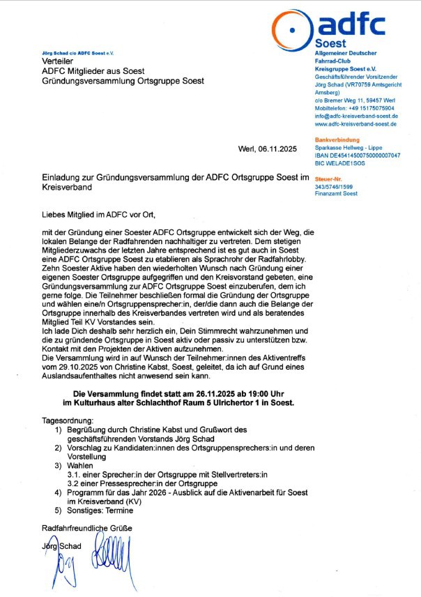 Aus dem Aktiventreffen vom 29.10.2025 wurde beschlossen die Gründung einer ADFC Ortsgruppe im KV SOest e.V. abzusprechen.