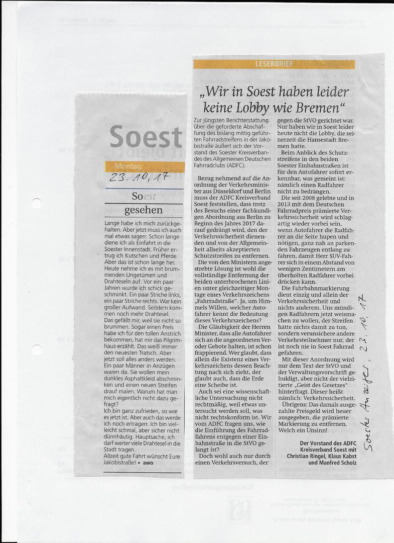 Was der ADFC in Soest besonders im Auge behält, ist die weitere Verbes-serung der Verkehrsverhältnisse für Radfahrer insbesondere bei zu planenden Baugebieten, so dass sie nicht benachteiligt werden und wie so oft der Autoverkehr Vorrang erhält. Hier muss sich die Stadt gegebenenfalls fragen lassen, ob man es ernst meint mit der Fahrradfreundlichkeit. Denn Parkplätze für ein Auto vor einem Geschäft zu schaffen und dafür die Radfahrer zusehen zu lassen, wo sie ihr Gefährt sicher abstellen können, ist aber auch noch nicht in die Köpfe der Geschäfteinhaber gedrungen. Denn was hat ein Geschäftsmann von einem Autostellplatz, wenn sechs Fahrräder den gleichen Raum beanspruchen? So sollten die Kaufleute doch mittlerweile wissen, dass sechs Radfahrer nicht nur arme Leute sind und viel mehr Geld im Geschäft lassen als ein einziger Autofahrer.